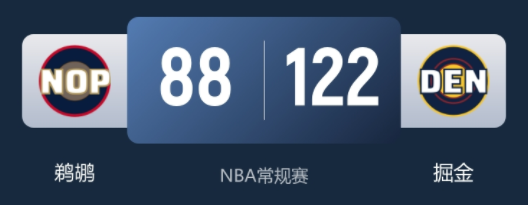 下半场,鹈鹕队状态依旧不佳,打了近8分钟仅得2分,掘金队则再掀进攻狂潮,打出一波29-2的超级攻击波,直接将领先优势扩大至30分以上。此役,约基奇发挥出色,轻松拿到三双数据。末节比赛,掘金队直接换上替补阵容练兵,但进攻火力丝毫不减,一度将领先优势扩大至40分以上。最终,掘金队以122-88大胜鹈鹕队,不仅自己拿到3连胜,还送给对手4连败。