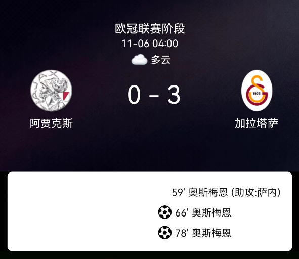 北京时间11月6日,欧冠联赛第4轮,阿贾克斯主场对阵加拉塔萨雷。第4分钟,莫基奥吃黄牌;第38分钟,加埃吃黄牌;第59分钟,奥斯梅恩头球破门,加拉塔萨雷1-0;第66分钟,奥斯梅恩点射,加拉塔萨雷2-0;第78分钟,奥斯梅恩再点射,加拉塔萨雷3-0。最终比分,阿贾克斯0-3加拉塔萨雷。