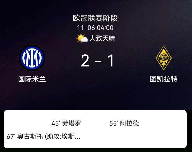 北京时间11月6日,欧冠联赛第4轮,国际米兰主场对阵阿拉木图凯拉特。第45分钟,劳塔罗两连击破门,国米1-0;第57分钟,阿拉德头球破门,凯拉特1-1;第67分钟,奥古斯托远射破门,国米2-1。全场无红黄牌判罚,最终比分,国际米兰2-1阿拉木图凯拉特。