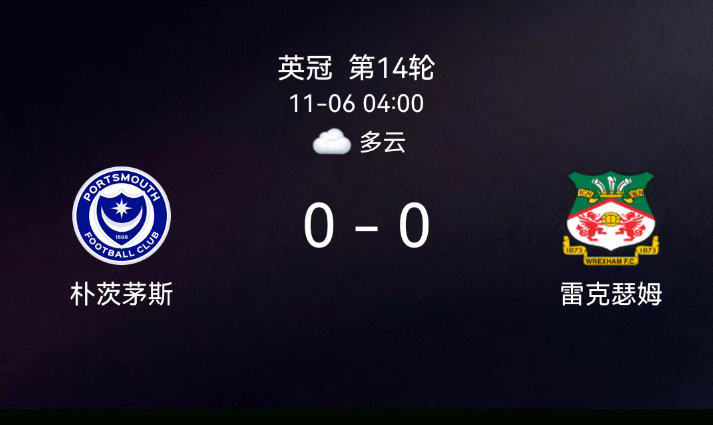 北京时间11月6日,英格兰足球冠军联赛第14轮,朴茨茅斯主场对阵雷克瑟姆。全场无进球产生,第11分钟朴茨茅斯球员吃黄牌;第41分钟希夫吃黄牌;第69分钟卡博雷吃黄牌;第73分钟比绍普、斯卡尔先后吃黄牌;第90+3分钟再出一张黄牌。最终比分,朴茨茅斯0-0雷克瑟姆。