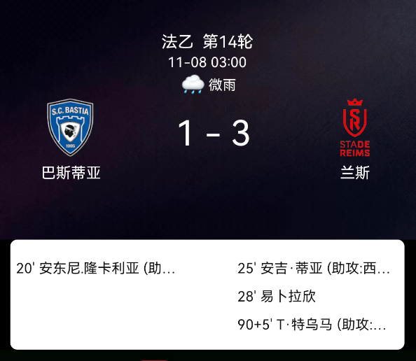 北京时间11月8日,法国足球乙级联赛第14轮,巴斯蒂亚对阵兰斯。第20分钟龙卡利亚破门,巴斯蒂亚1-0;第25分钟安热-马夏尔-蒂亚破门,兰斯1-1;第28分钟哈菲兹-易卜拉欣破门,兰斯2-1;第45+1分钟巴斯蒂亚吃黄牌;第90+5分钟托伊马破门,兰斯3-1。最终比分,巴斯蒂亚1-3兰斯。