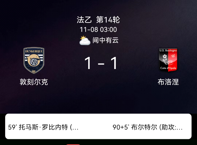 北京时间11月8日,法国足球乙级联赛第14轮,敦刻尔克对阵博莱格尼。第35分钟博莱格尼吃黄牌;第59分钟罗比内破门,敦刻尔克1-0;第90+5分钟布尔特尔破门,博莱格尼1-1;全场无红牌。最终比分,敦刻尔克1-1博莱格尼。