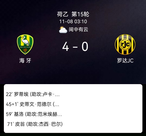 北京时间11月8日,荷兰乙级联赛第15轮,ADO海牙对阵罗达JC。第22分钟罗捷破门,ADO海牙1-0;上半场补时1分钟范德斯洛特破门,2-0;第59分钟JuhoKilo破门,3-0;第67分钟罗达JC吃黄牌;第71分钟珀皮翁破门,4-0。最终比分,ADO海牙4-0罗达JC。