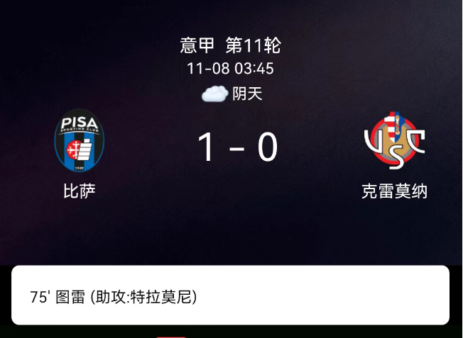 北京时间11月8日,意大利足球甲级联赛第11轮,比萨对阵克雷莫内塞。第17分钟比萨吃黄牌;第39分钟克雷莫内塞吃黄牌;第48分钟比萨吃黄牌;第75分钟伊德里萨-图雷破门,比萨1-0;第78分钟克雷莫内塞吃黄牌;第83分钟比萨吃黄牌;第90+5分钟比萨吃黄牌;全场无红牌。最终比分,比萨1-0克雷莫内塞。