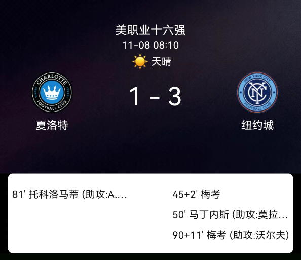 北京时间11月8日,美国职业大联盟1/8决赛,夏洛特对阵纽约城。上半场补时2分钟尼古拉斯-费尔南德斯破门,纽约城1-0;第50分钟阿德里安-马丁内斯破门,2-0;第68分钟夏洛特吃黄牌;第81分钟古尔诺破门,夏洛特1-2;第90+10分钟尼古拉斯-费尔南德斯再破门,3-1;全场无红牌。最终比分,夏洛特1-3纽约城。