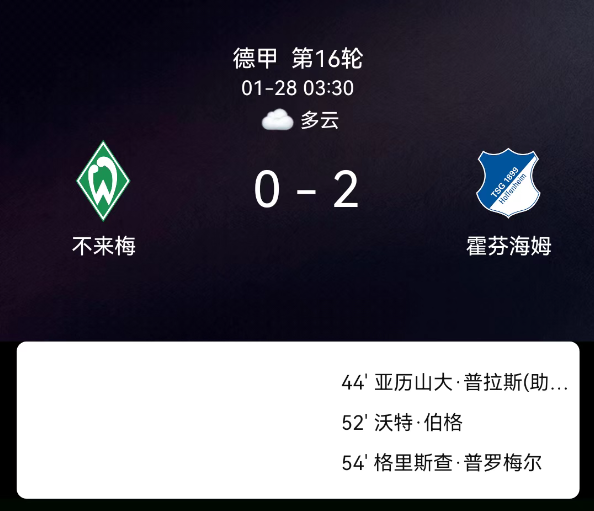 北京时间1月28日,德国足球甲级联赛第16轮,云达不莱梅主场对阵霍芬海姆。第44分钟普拉斯破门0-1;第52分钟布格尔红牌;第54分钟普罗梅尔破门0-2;无其他红黄牌。最终比分,云达不莱梅0-2霍芬海姆。