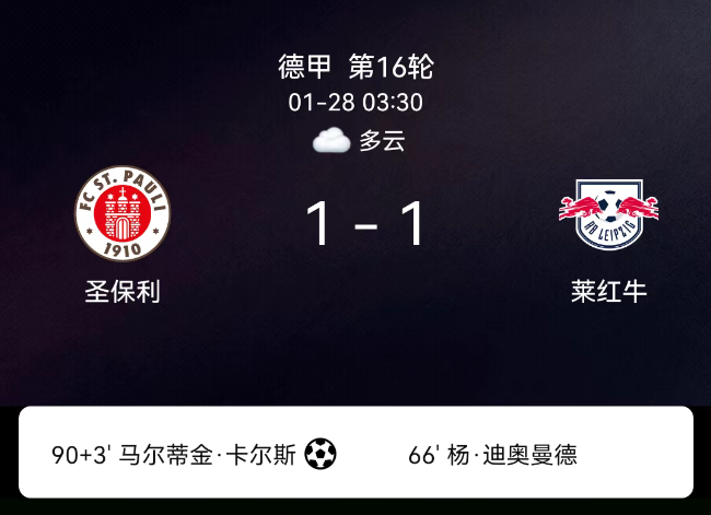 北京时间1月28日,德国足球甲级联赛第16轮,圣保利主场对阵RB莱比锡。第66分钟迪奥曼德破门0-1;补时3分钟卡尔斯点射1-1;双方无红黄牌。最终比分,圣保利1-1RB莱比锡。