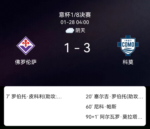 北京时间1月28日,意大利杯1/8决赛,佛罗伦萨主场对阵科莫。第7分钟皮科利破门1-0;第20分钟罗贝托破门1-1;第60分钟帕斯破门1-2;补时1分钟莫拉塔破门1-3;双方无红黄牌。最终比分,佛罗伦萨1-3科莫。