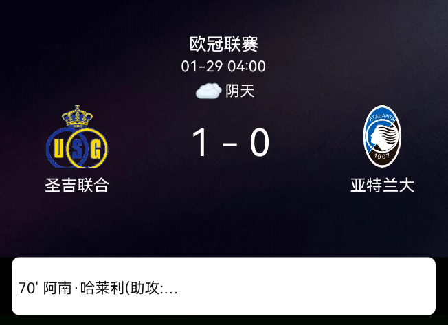 北京时间1月29日,欧冠联赛阶段第8轮,圣吉罗斯联合主场对阵亚特兰大。第10分钟伯吉斯染黄;第28分钟萨马尔季奇染黄;第70分钟哈利利破门1-0。最终比分,圣吉罗斯联合1-0亚特兰大。