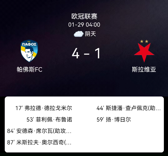 北京时间1月29日,欧冠联赛阶段第8轮,帕福斯主场对阵布拉格斯拉维亚。第17分钟德拉戈米尔破门1-0;第44分钟哈劳佩克破门1-1;第53分钟布鲁诺-索萨破门2-1;第59分钟博日尔直红;第84分钟安德森-席尔瓦破门3-1;第87分钟奥尔西奇破门4-1。最终比分,帕福斯4-1布拉格斯拉维亚。