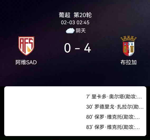 北京时间2月3日,葡萄牙足球超级联赛第20轮,阿维什镇主场对阵布拉加。第7分钟奥尔塔破门0-1;第30分钟萨拉萨尔破门0-2;第80分钟保-维克托破门0-3;第83分钟保-维克托破门0-4;双方无红黄牌。最终比分,阿维什镇0-4布拉加。