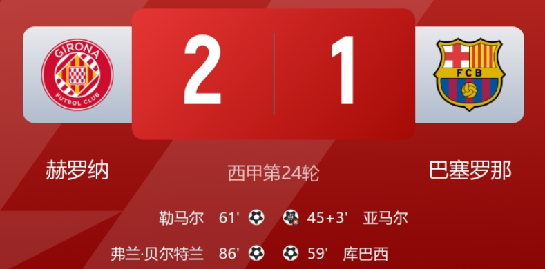 2月17日消息,西甲第24轮焦点战,赫罗纳在主场蒙蒂利维球场对阵巴塞罗那,上半场比赛里,亚马尔错失单刀机会,拉菲尼亚的射门击中立柱,随后奥尔莫制造点球,亚马尔主罚再度打中门柱。下半场,库巴西打入个人本赛季首球,勒马尔为赫罗纳扳平比分,贝尔特兰完成绝杀,罗卡在读秒阶段被红牌罚下,最终赫罗纳2-1击败巴萨,积分榜上,巴萨积58分,落后榜首皇马2分。