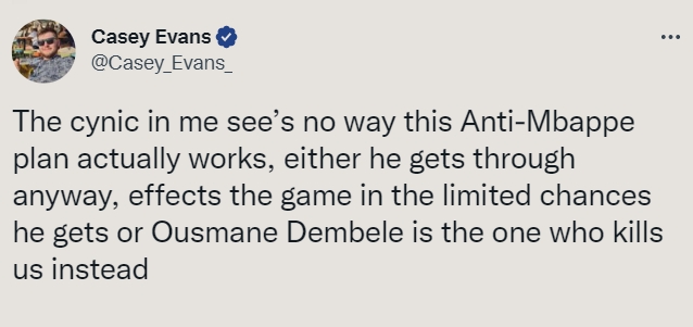 记者Casey Evans则不认为这个所谓“反姆巴佩计划”能够奏效:我认为这个“反姆巴佩计划”不可能真正奏效。要么这个计划无法限制姆巴佩,要么是姆巴佩抓住仅有的机会影响比赛,再不然换成登贝莱也能杀死我们。