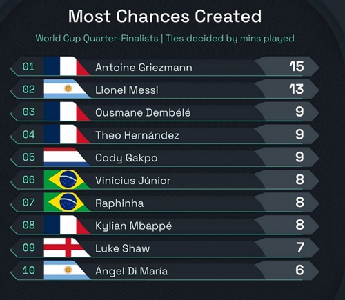 12月9日讯 本届世界杯激战正酣,数据网站Squawka也盘点了8强球员创造机会最多的球员榜单,其中格列兹曼15次居首,梅西13次紧随其后,以下为具体榜单(并列则以上场时间决定排名):