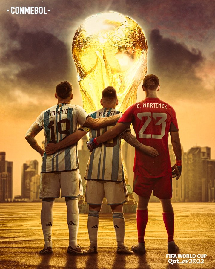 南美足联官推也制作海报祝贺阿根廷队,海报中梅西与马丁内斯、奥塔门迪并肩而战,前方不远便是冠军金杯。南美足联在推文中写道:“为了荣耀!阿根廷将在周日出战决赛,目标是把冠军奖杯带回南美大陆。”