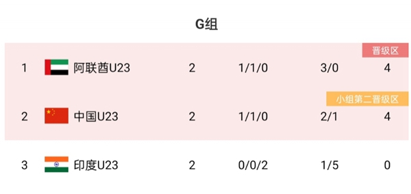 预选赛中,中国国奥0-0阿联酋、2-1印度,最终以成绩最好的4个小组第二身份晋级正赛。