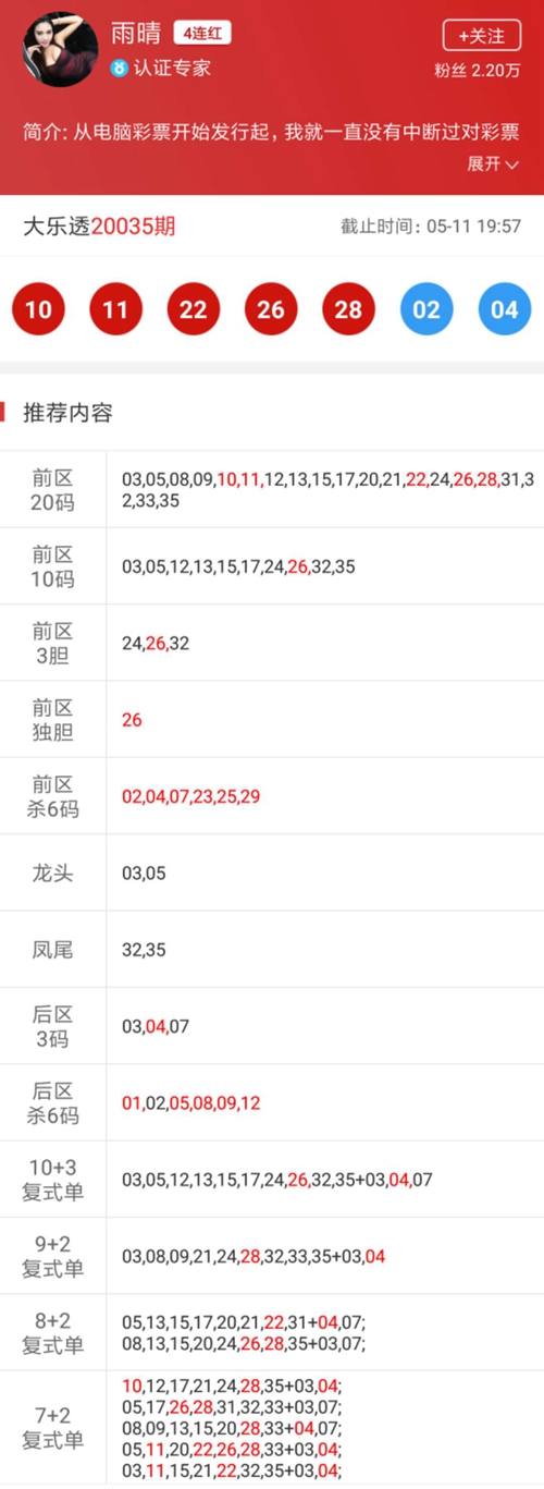 5月11日,体彩大乐透迎来“9.9亿元大派奖”第六期开奖。第20035期前区开出号码“10、11、22、26、28”,后区开出号码“02、04”。
