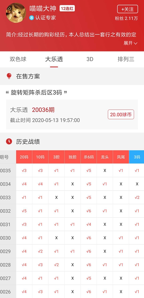 专家「喵喵大神」近期推荐成绩优秀,在最近的10次开奖中,推荐前区3胆10中8,后区3码10中9。其中10+3复式中奖5次、9+2复式中奖3次、8+2复式中奖3次,7+2复式中奖7次。