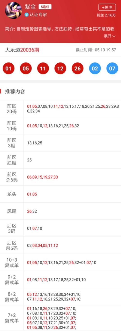 值得一提的是,在034期开奖中紫金推荐也曾命中二等奖,近期状态火爆。目前推荐10+3复式、8+2复式、7+2复式连续4期全部中奖。