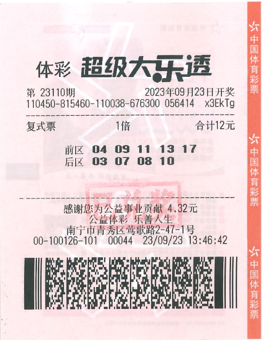 9月23日,体彩超级大乐透第23110期前区开出号码“04、09、11、13、17 ”,后区开出号码“07、08”。本期全国共中出3注一等奖,单注奖金为1000万元,其中1注花落广西南宁4500100126体彩实体店。