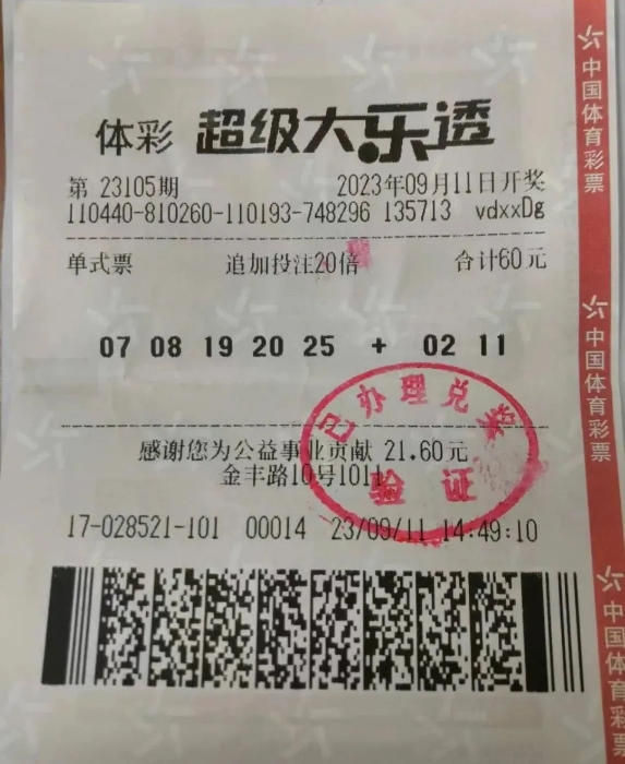 9月11日下午,方先生到南城街道金丰路4417028521体彩实体店,看着历史开奖号码信息随手写下1注号码,并按照往常的投注习惯,购买了一注追加20倍的大乐透彩票。