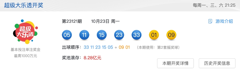 奖池方面,本期开奖结束后,8.28亿元滚存至10月25日(周三)开奖的第23122期。