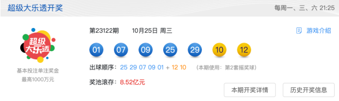 奖池方面,本期开奖结束后,8.52亿元滚存至10月28日(周六)开奖的第23123期。