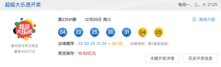 奖池方面,本期开奖结束后,10.62亿元滚存至12月11日(周一)开奖的第23142期。