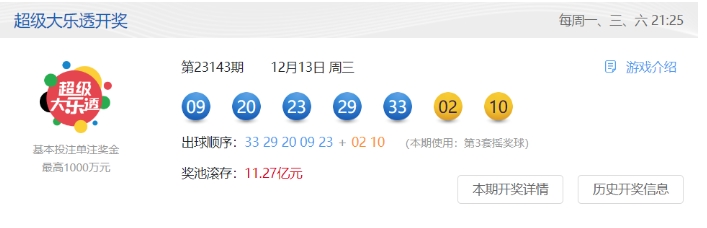 12月13日,体彩超级大乐透第23143期前区开出号码“09、20、23、29、33”,后区开出号码“02、10”。本期全国销量为2.90亿元,为国家筹集彩票公益金1.04亿元。