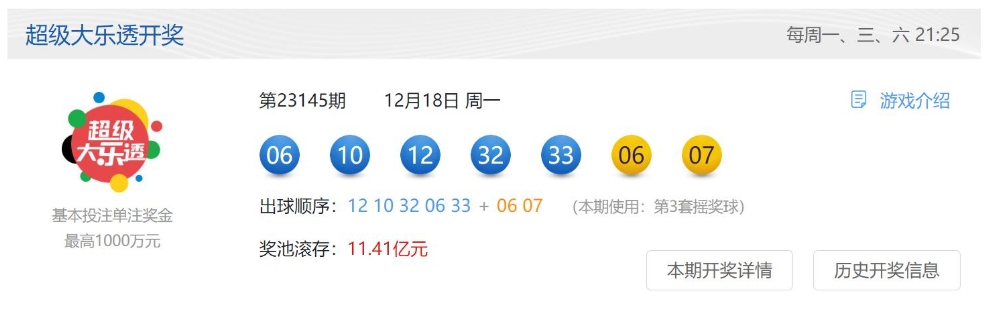 12月18日,体彩超级大乐透第23145期前区开出号码“06、10、12、32、33”,后区开出号码“06、07”。本期全国销量为2.81亿元,为国家筹集彩票公益金1.01亿元。