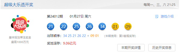 1月27日,体彩超级大乐透第24012期前区开出号码“21、22、25、26、34 ”,后区开出号码“01、09”。本期全国销量为3.02亿元,为国家筹集彩票公益金1.08亿元。