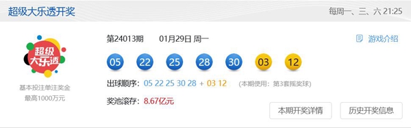 奖池方面,本期开奖结束后,8.67亿元滚存至1月31日(周三)开奖的第24014期。