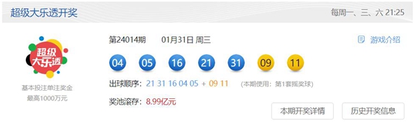 奖池方面,本期开奖结束后,8.99亿元滚存至2月3日(周六)开奖的第24015期。