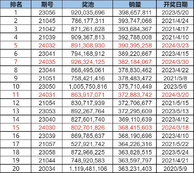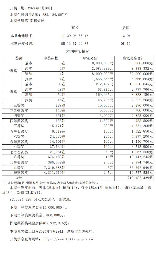 北京时间3月30日晚,体彩超级大乐透第24035期开奖,同时本期也是大乐透10亿大派奖的第6期。当期开奖号码为前区05 13 17 29 33,后区05 12。本期大乐透销量为382,184,067元,排名大乐透单期销量历史第7位!
