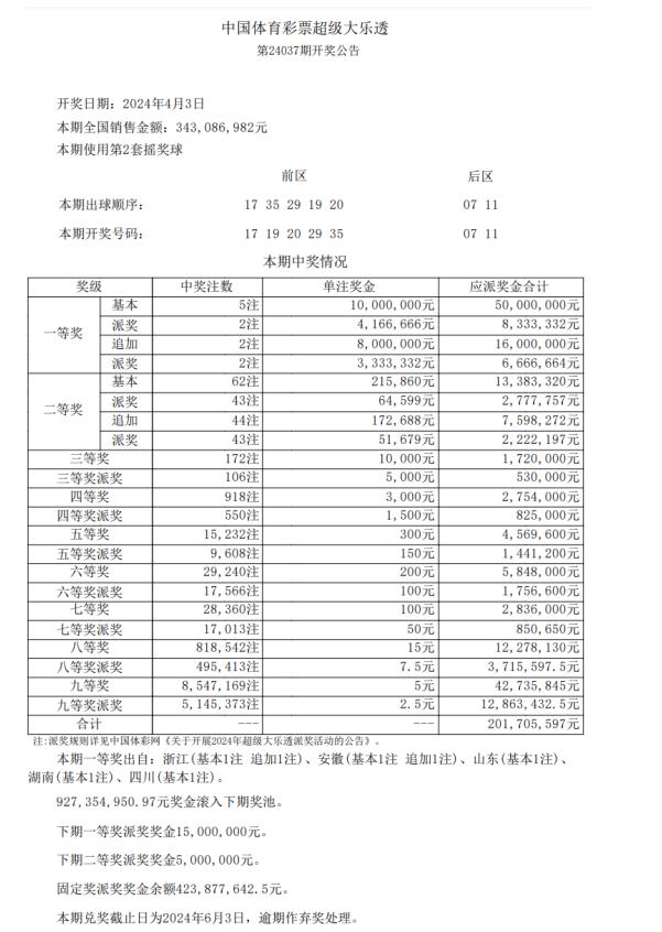 二等奖开出62注,每注基本奖金为21.5万余元;其中44注采用追加投注,多揽17.2万元,单注奖金38.8万余元。本期共有43注二等奖符合本次派奖参与条件,单注奖金为(基本奖金21.5万+追加奖金17.2万+基本奖金派奖6.4万+追加奖金派奖5.1万)50.4万余元。奖池方面,本期开奖结束后,9.27亿元滚存至4月6日(周六)开奖的第24038期。