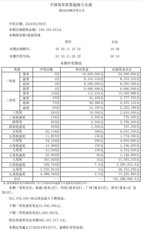 北京时间4月8日晚,体彩超级大乐透第24039期开奖,同时本期也是大乐透10亿大派奖的第10期。当期开奖号码为前区03 10 11 20 22,后区06 10。
