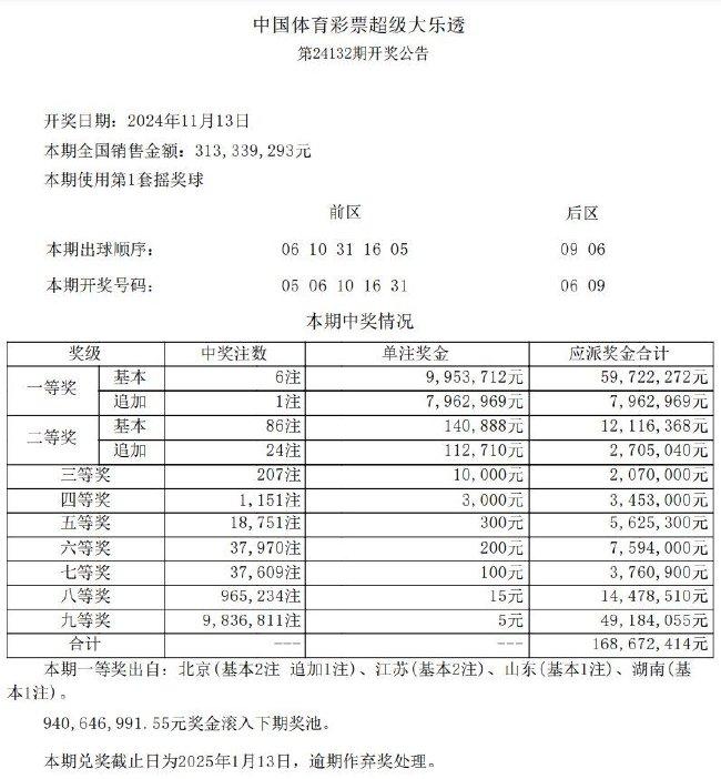 北京时间11月13日晚,体彩大乐透第24132期开奖,当期开奖号码为:前区05 06 10 16 31,后区06 09。