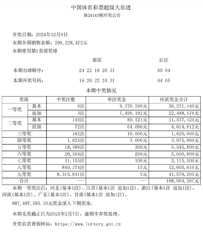 北京时间12月9日晚,体彩大乐透第24143期开奖,当期开奖号码为前区16 20 22 24 31,后区04 05。