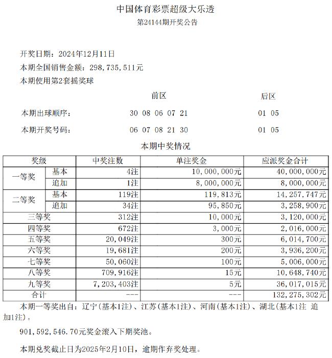 本期大乐透全国销量为2.98亿元,奖池方面,9.01亿余元滚存至12月14日(周六)开奖的第24145期。