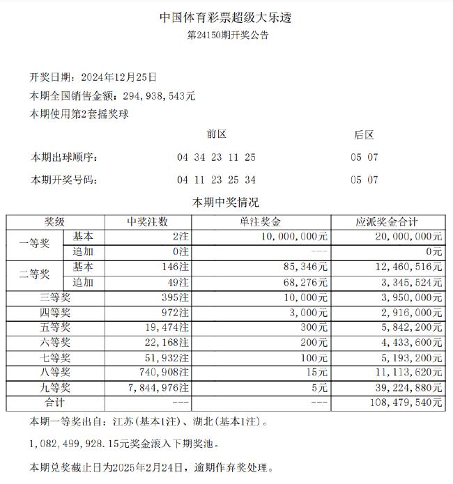 北京时间12月25日晚,体彩大乐透第24150期开奖,当期开奖号码为:前区04 11 23 25 34+后区05 07。