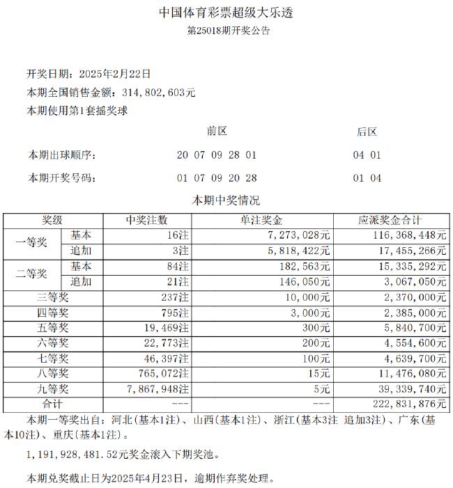 在万众瞩目的期待中,北京时间2月22日晚,体彩大乐透第25018期开奖结果揭晓。本期开奖号码犹如繁星点点,前区号码为01、07、09、20、28,后区号码则为01、04,为无数彩民带来了希望和梦想。