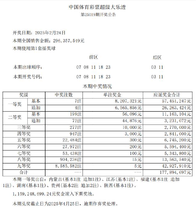 本期全国销量为2.96亿元,奖池方面,11.59亿余元滚存至2月26日(周三)开奖的第25016期。