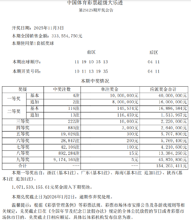 本期全国销量为3.33亿元,奖池方面,10.71亿余元滚存至11月5日(周三)开奖的第25126期。