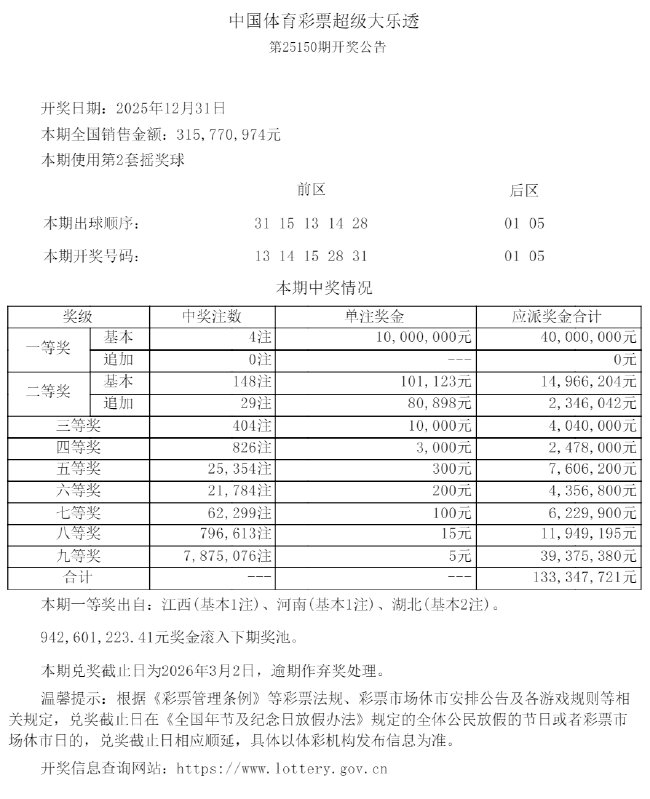 北京时间12月31日晚,体彩大乐透第25150期开奖,当期开奖号码为前区13 14 15 28 31,后区01 05。