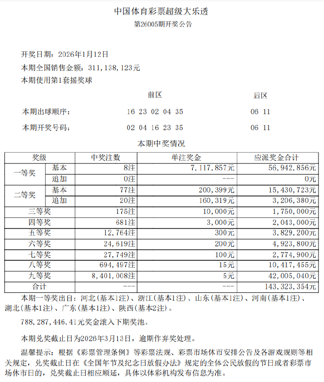 本期全国开出8注一等奖,单注奖金711万余元,均未选择追加。8注基本头奖出自陕西(2注)、河北、浙江、山东、河南、湖北和广东。二等奖开出77注,单注奖金20万余元,其中20注采用追加投注,每注多得奖金16万余元。本期全国销量为3.11亿元,奖池方面,7.88亿余元滚存至1月14日(周三)开奖的第26006期。