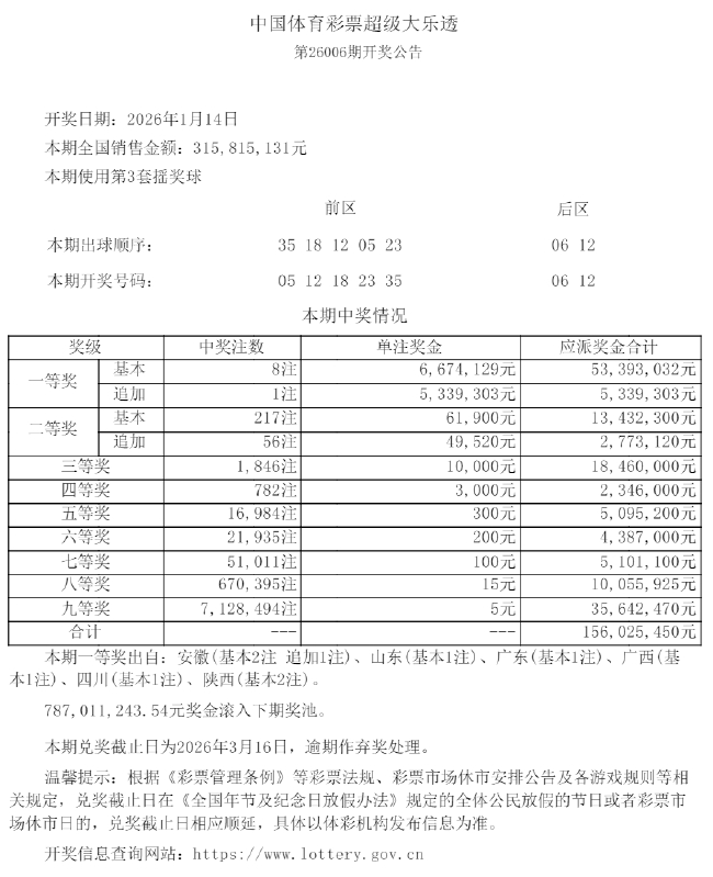 北京时间1月14日晚,体彩大乐透第26006期开奖,当期开奖号码为前区05 12 18 23 35,后区06 12。