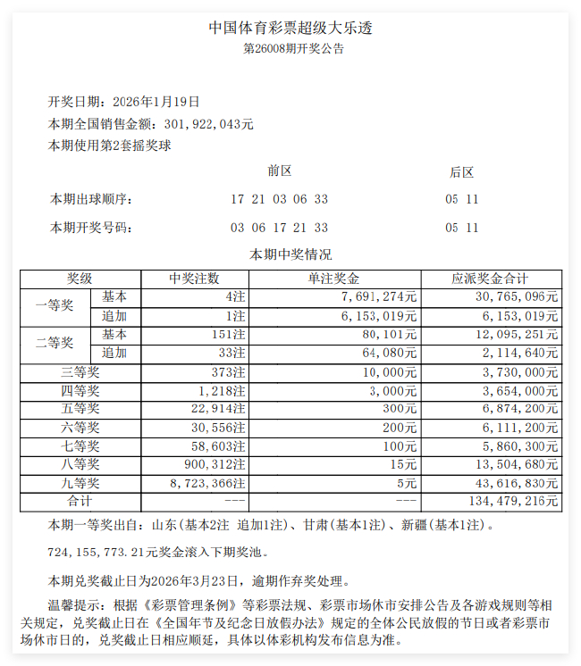 本期全国开出4注一等奖,单注奖金769万余元,其1注选择追加,多得奖金615万余元出自山东;3注基本头奖分落山东、甘肃、新疆。二等奖开出151注,单注奖金8万余元,其中33注采用追加投注,每注多得奖金6.4万余元。本期全国销量为3.01亿元,奖池方面,7.24亿余元滚存至1月21日(周三)开奖的第26009期。