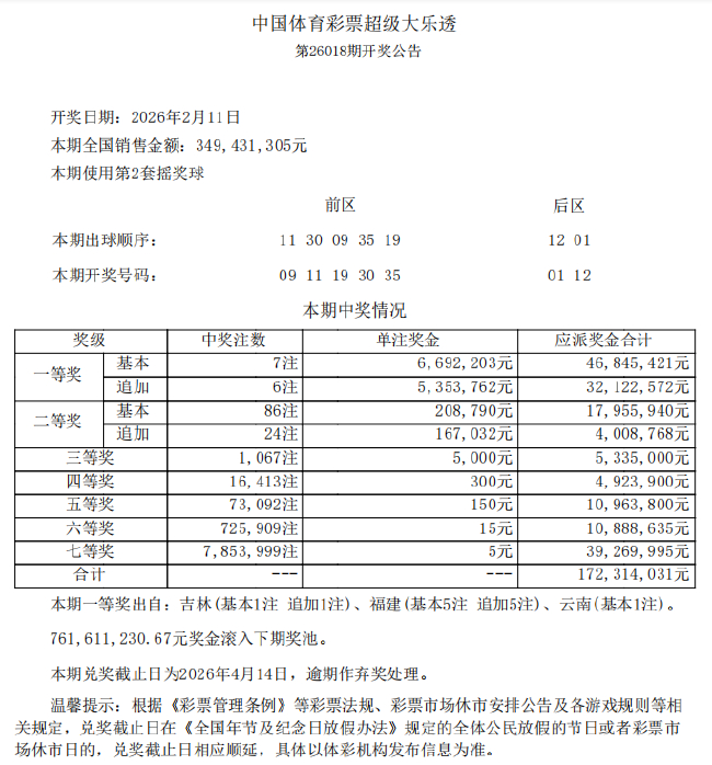 北京时间2月11日晚,体彩大乐透第26018期开奖,当期开奖号码为前区09 11 19 30 35,后区01 12。本期是大乐透规则变更后的第五期,原九等奖级变更为现七等奖级,具体详情点击查看:中国体育彩票超级大乐透游戏规则