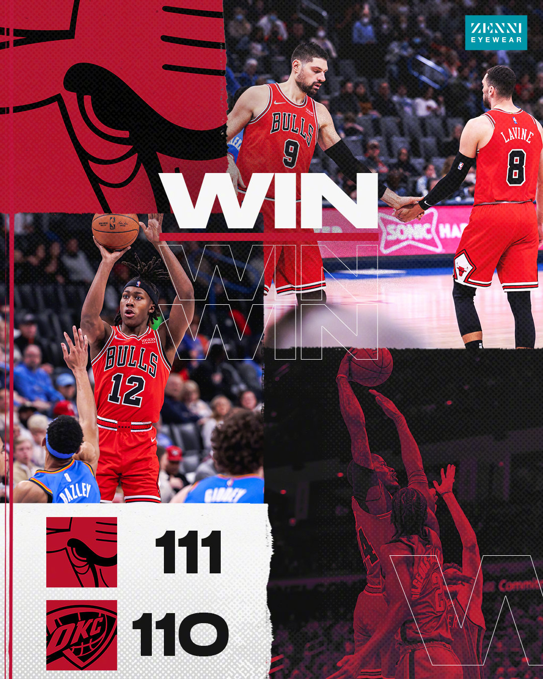 公牛客场挑战雷霆,公牛近期饱受伤病困扰,卡鲁索还因格雷森-阿伦的恶意犯规导致骨折,目前排名已经下滑到东部第三。雷霆战胜篮网之后遭遇了5连败,现在仅高于火箭排在西部倒数第二。本场比赛拉文复出,德罗赞轮休。一开场,前半段双方咬得很紧,公牛在对攻中逐渐上风,领先8分结束首节。次节比赛,公牛一波7-0将分差拉开到两位数,雷霆连中三个三分缩小分差,公牛回敬10-4的小高潮重夺领先,半场战罢公牛58-48领先10分。易边再战,雷霆突然断电,公牛轻松将分差拉开到20分以上。拉文因伤返回更衣室,雷霆及时回暖连中三分缩小分差,三节打完公牛领先14分。第四节,雷霆奋力反击,多点开花将分差迫近到只剩1分。关键时刻拉文两罚全中,亚历山大错失绝平三分,公牛险胜过关。