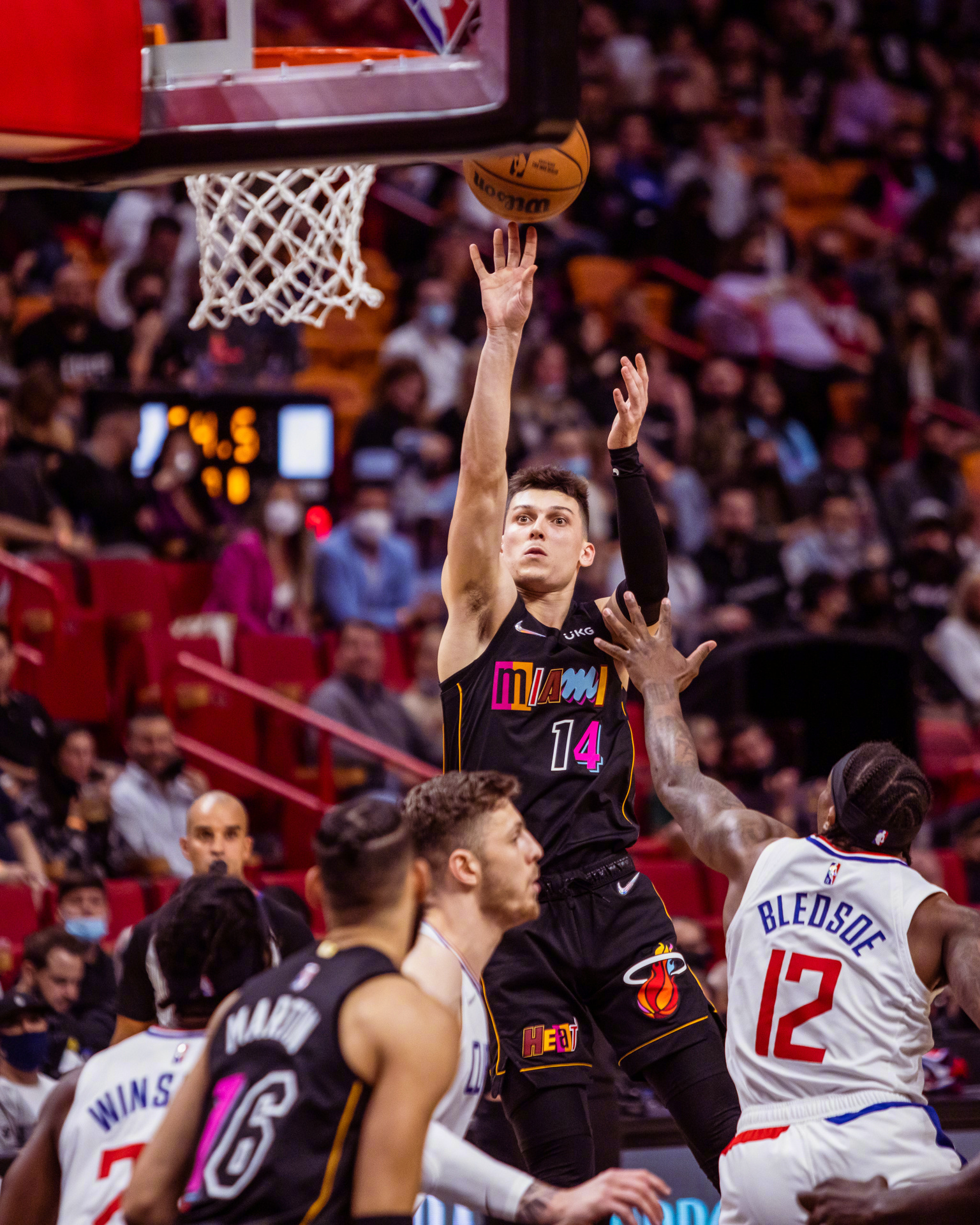 热火主场迎战快船,此前两队均获得两连胜,洛瑞,小莫里斯等人本场继续缺阵。首节上来前三分钟热火陷入得分荒,但快船进攻效率也不高,随后热火逐渐手感回暖,连续进攻禁区建立领先优势,热火单节28-19领先。次节回来,两队防守强度加大,进攻端连续在禁区做文章,节末布莱德索连续完成上篮,巴特勒则连续站上罚球线作出回应,半场结束热火57-45保持领先。易边再战,两队进入对攻战,文森特突然爆发,单节连续命中6记三分, 帮助热火一度将分差拉开到20分,但科菲带领快船众人发力,一直紧咬,并一度缩小分差至11分,节末斯特鲁斯三分也中,热火96-80领先进入末节。第四节回来,热火进攻端连续出现失误,肯纳德手感火热,快船稳扎稳打逐渐蚕食分差至个位数,节末塔克和希罗连续两记三分稳住局势,快船连续得分一度追至4分但为时已晚,最终热火有惊无险121-114胜快船取三连胜。